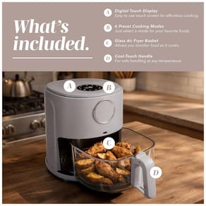 Air fryer com 6 programas pré-configurados, painel digital touch, cesto de vidro com visualização total do alimento, temporizador de até 60 minutos, estrutura externa em aço inoxidável.Porta-fio