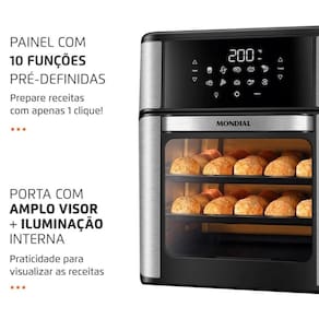 - 2 em 1 - Air Fryer + Forno: A família de Air Fryers Mondial continua crescendo! O modelo OVEN alia as vantagens da tecnologia da Air Fryer ao espaço e versatilidade do forno. Você pode assar, cozinhar e fritar sem óleo e com perfeição;