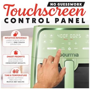 A fritadeira elétrica Gourmia GAF823G é uma air fryer de bancada com capacidade aproximada de 7,6 litros, adequada para preparo de refeições completas para famílias ou várias porções de uma só vez. A tecnologia FryForce 360 utiliza circulação rápida de ar quente com potência de 1700W, permitindo preparar alimentos com textura crocante usando pouco ou nenhum óleo. A faixa de temperatura aproximada varia de 32 °C a 204 °C, contemplando desde aquecimento suave até cocção em alta temperatura.