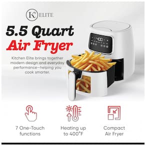 A fritadeira elétrica Kitchen Elite AF550PK é uma air fryer digital de bancada com capacidade de 5,5 litros, indicada para preparar refeições diárias para 2 a 4 pessoas. O cesto comporta porções de batatas fritas, carnes, frango, legumes e lanches diversos em um formato compacto de fácil acomodação na bancada.