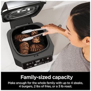 O QUE ESTÁ INCLUÍDO: Ninja Foodi Grill, Grelha de 25 cm x 25 cm, Cesta Crisp de 3,8 litros, Panela de Cozimento de 5,7 litros, Livro de Receitas com 15 receitas criadas por chefs e Escova de Limpeza.
