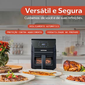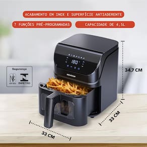Capacidade de 4.5 litros, ideal para famílias ou refeições em grupo Tecnologia de fritura sem óleo para refeições mais saudáveis Design moderno e compacto que se encaixa perfeitamente na sua cozinha Controles intuitivos para ajustar a temperatura e o tempo de cozimento Cesta removível e fácil de limpar para uma experiência sem complicações . 7 Tipos de preparo automáticos.Porta-fio