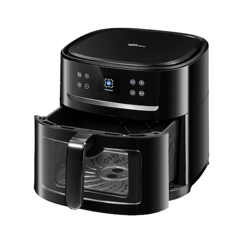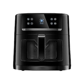 Fritadeira elétrica com capacidade de 8L, controle touch screen, painel digital, função pausar, 12 receitas pré-programadas, cesto removível, suporte interno removível, cesto com visor transparente.Porta-fio