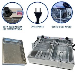 Fritadeira elétrica industrial com 2 cubas independentes de 5 litros cada, ideal para cozinhas comerciais ou residenciais com alta demanda. Fabricada em inox de alta qualidade, oferece excelente retenção de calor e fácil higienização. Possui termostato ajustável de 50°C a 300°C.Porta-fio