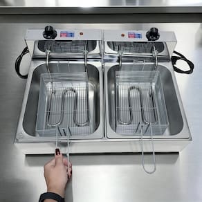 Fritadeira elétrica industrial com 2 cubas independentes de 5 litros cada, permitindo fritar diferentes alimentos simultaneamente. Fabricada em inox de alta qualidade. Termostato ajustável de 50°C a 300°C.Porta-fio