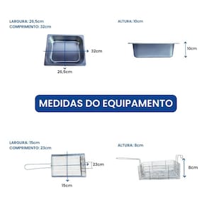 CARACTERÍSTICAS GERAIS: Capacidade Total da Cuba: 5 Litros cada (sendo óleo + alimento) Capacidade de Óleo: de 2 a 3L Litros cada Capacidade Total 2 Cubas: 10L (sendo óleo + alimento) Termostato de 50°C a 300°C (com regulagem) Voltagens 110 e 220 (não é Bivolt)