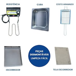 Características Gerais do produto Cuba 5 Litros + Escorredor M. Sistemetrosa de aquecimetrosento cometros termetrosostato ajustável até 300°C. Sistemetrosa antichametrosas. Uso Cometrosercial e Residencial.