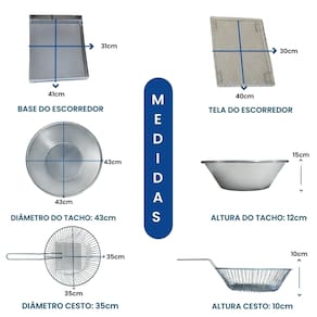 Tacho Redondo 10 Litros + Escorredor G Esse Kit conta com um super moderno escorredor (tamanho grande) para que sua fritura saia bem sequinha e um tacho 10 litros, projetado para o preparo de alimentos fritos em ambientes comerciais, como restaurantes, lanchonetes, quiosques e cozinhas residências. Possui termostato regulável de qualidade e com alça para escorrer o óleo e deixar sua fritura sequinha e com cabos reforçados e qualidade INOX. Características que Fazem a Diferença: Capacidade Total da Cuba: 10 Litros (óleo + alimentos)Capacidade de Óleo: de 5 a 7,5 LitrosTermostato Ajustável: De 50°C a 300°C, com regulagem precisa Instruções Rápidas para Uso: Nunca ligue a fritadeira sem óleo.Atenção com temperaturas acima de 200°C, pois podem causar queima do óleo.Para medir o óleo, faça a medição com água, sempre com a fritadeira desligada.Atenção: Nunca misture água e óleo e nunca ligue a fritadeira com água. Especificações Técnicas: Voltagem: 110V (2.500W) ou 220V (3.000W)Tomada: 20ADimensões: Altura: 15cm | Diâmetro: 43cmDimensões Escorredor G: Comprimento: 41cm | Largura: 31cmUso: Comercial e Residencial Conteúdo da Embalagem: 01 Aro Inox 01 Cabeçote com resistência blindada01 Cesto de fritura aramado01 Tacho Alumínio01 Escorredor G01 Manual de instruções Marca: Não Informado