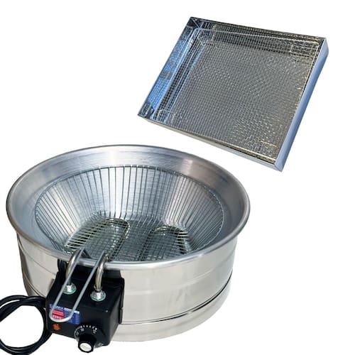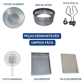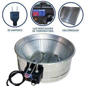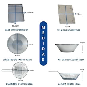 Tacho Redondo 10 Litros + Escorredor M Esse Kit conta com um super moderno escorredor (tamanho médio) para que sua fritura saia bem sequinha e um tacho 10L esmaltado, projetado para o preparo de alimentos fritos em ambientes comerciais, como restaurantes, lanchonetes, quiosques e cozinhas residências. Possui termostato regulável de qualidade e com alça para escorrer o óleo e deixar sua fritura sequinha e com cabos reforçados e qualidade INOX. Características que Fazem a Diferença:Capacidade Total da Cuba: 10 Litros (óleo + alimentos)Capacidade de Óleo: de 5 a 7,5 LitrosTermostato Ajustável: De 50°C a 300°C, com regulagem precisa Instruções Rápidas para Uso:Nunca ligue a fritadeira sem óleo.Atenção com temperaturas acima de 200°C, pois podem causar queima do óleo.Para medir o óleo, faça a medição com água, sempre com a fritadeira desligada.Atenção: Nunca misture água e óleo e nunca ligue a fritadeira com água. Especificações Técnicas:Voltagem: 110V (2.500W) ou 220V (3.000W)Tomada: 20ADimensões: Altura: 16cm | Diâmetro: 44cmDimensões Escorredor M: Comprimento: 33,5cm | Largura: 26,5cmUso: Comercial e Residencial Conteúdo da Embalagem: 01 Aro Inox 01 Cabeçote com resistência blindada01 Cesto de fritura aramado01 Tacho Alumínio01 Escorredor01 Manual de instruções Marca: Não Informado