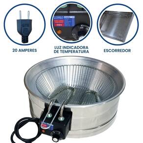 Tacho esmaltado de 10 litros com escorredor médio. Termostato regulável de 50°C a 300°C. Cabos reforçados em inox. Uso comercial e residencial.