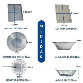 Tacho Redondo 10 Litros + Escorredor M Esse Kit conta com um super moderno escorredor (tamanho médio) para que sua fritura saia bem sequinha e um tacho 10L esmaltado, projetado para o preparo de alimentos fritos em ambientes comerciais, como restaurantes, lanchonetes, quiosques e cozinhas residências. Possui termostato regulável de qualidade e com alça para escorrer o óleo e deixar sua fritura sequinha e com cabos reforçados e qualidade INOX. Características que Fazem a Diferença:Capacidade Total da Cuba: 10 Litros (óleo + alimentos)Capacidade de Óleo: de 5 a 7,5 LitrosTermostato Ajustável: De 50°C a 300°C, com regulagem precisa Instruções Rápidas para Uso:Nunca ligue a fritadeira sem óleo.Atenção com temperaturas acima de 200°C, pois podem causar queima do óleo.Para medir o óleo, faça a medição com água, sempre com a fritadeira desligada.Atenção: Nunca misture água e óleo e nunca ligue a fritadeira com água. Especificações Técnicas:Voltagem: 110V (2.500W) ou 220V (3.000W)Tomada: 20ADimensões: Altura: 16cm | Diâmetro: 44cmDimensões Escorredor M: Comprimento: 33,5cm | Largura: 26,5cmUso: Comercial e Residencial Conteúdo da Embalagem: 01 Aro Inox 01 Cabeçote com resistência blindada01 Cesto de fritura aramado01 Tacho Alumínio01 Escorredor01 Manual de instruções Marca: Não Informado