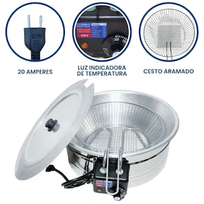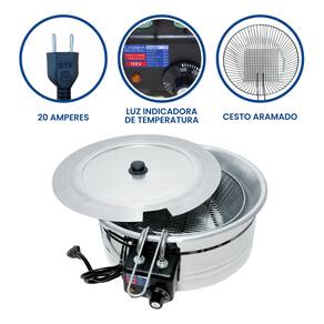 Fritadeira elétrica industrial com tacho redondo de 10 Litros e tampa. Indicada para restaurantes, lanchonetes, quiosques e cozinhas residenciais de alto desempenho. Tacho redondo para distribuição uniforme de calor. Tampa inclusa para proteção contra respingos, preservação da temperatura do óleo e higiene.Porta-fio