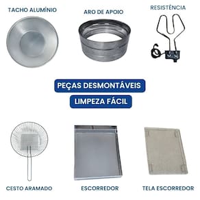 Capacidade Total da Cuba: 10 Litros. Capacidade de Óleo: de 5 a 6 Litros. Termostato Ajustável: De 50°C a 300°C. Aro, Tacho Esmalte e Cabeçote com materiais que garantem a durabilidade. Cesto aramado estanhado. Cabeçote removível. Alça projetada para um melhor escorrimento do óleo.Porta-fio