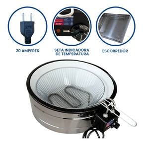 Tacho Redondo 10 Litros + Escorredor M Esse Kit conta com um super moderno escorredor (tamanho Médio) para que sua fritura saia bem sequinha e um tacho 10L esmaltado, projetado para o preparo de alimentos fritos em ambientes comerciais, como restaurantes, lanchonetes, quiosques e cozinhas residências. Possui termostato regulável de qualidade e com alça para escorrer o óleo e deixar sua fritura sequinha e com cabos reforçados e qualidade ESMALTADO. Características que Fazem a Diferença:Capacidade Total da Cuba: 10 Litros (incluindo óleo e alimentos)Capacidade de Óleo: de 5 a 6 LitrosTermostato Ajustável: De 50°C a 300°C, com regulagem precisaAro, Tacho Esmalte e Cabeçote com materiais que garantem a durabilidade.Cesto aramado estanhado, proporcionando uma fritura uniforme.Cabeçote removível para facilitar a limpeza.Alça projetada para um melhor escorrimento do óleo. Instruções Rápidas para Uso:Ajuste a temperatura usando o termostato e observe a lâmpada piloto de aquecimento.Nunca ligue a fritadeira sem óleo.Atenção com temperaturas acima de 200°C, pois podem causar queima do óleo.Para medir o óleo, faça a medição com água, sempre com a fritadeira desligada.Atenção: Nunca misture água e óleo e nunca ligue a fritadeira com água. Especificações Técnicas:Voltagem: 110V (2.500W) ou 220V (3.000W)Tomada: 20ADimensões: Altura: 16cm | Diâmetro: 44cm Dimensões: Escorredor (médio): Comp: 33,5cm | Larg: 26,5cm Uso: Comercial e Residencial Conteúdo da Embalagem:01 Aro Inox 01 Cabeçote com resistência blindada01 Cesto de fritura aramado01 Tacho Esmalte 01 Escorredor 01 Manual de instruções Marca: Não Informado