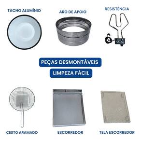 Tacho esmaltado com termostato regulável e escorredor médio. Cabeçote removível para facilitar a limpeza. Alça projetada para melhor escorrimento do óleo.