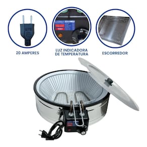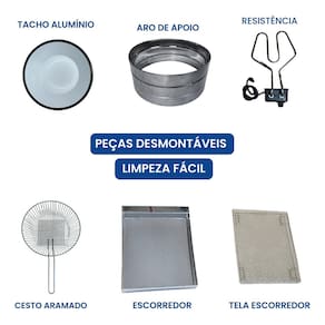Tacho Esmaltado 10L com Escorredor Médio e Tampa. Termostato regulável de 50°C a 300°C. Cabeçote removível para facilitar a limpeza. Alça para escorrer o óleo. Cesto aramado estanhado.Porta-fio