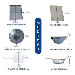 Kit Tacho Redondo 5 Litros + Escorredor M. Possui termostato regulável de qualidade e com alça para escorrer o óleo e deixar sua fritura sequinha e com cabos reforçados e qualidade INOX. Uso: Comercial e Residencial.Cesto removível