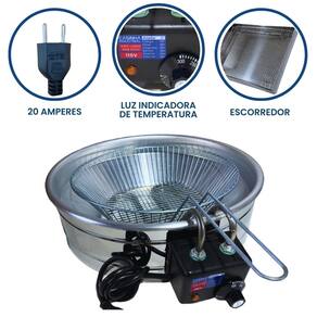 Tacho redondo com escorredor, ideal para frituras em ambientes comerciais e residenciais. Possui termostato regulável e cabos reforçados em inox.