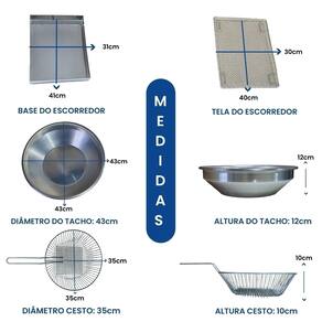 Tacho Redondo 7 Litros + Escorredor G Esse Kit conta com um super moderno escorredor (tamanho grande) para que sua fritura saia bem sequinha e um tacho 7 litros, projetado para o preparo de alimentos fritos em ambientes comerciais, como restaurantes, lanchonetes, quiosques e cozinhas residências. Possui termostato regulável de qualidade e com alça para escorrer o óleo e deixar sua fritura sequinha e com cabos reforçados e qualidade INOX. Características que Fazem a Diferença: Capacidade Total da Cuba: 7 Litros (óleo + alimentos)Capacidade de Óleo: de 4 a 5 LitrosTermostato Ajustável: De 50°C a 300°C, com regulagem precisa Instruções Rápidas para Uso: Nunca ligue a fritadeira sem óleo.Atenção com temperaturas acima de 200°C, pois podem causar queima do óleo.Para medir o óleo, faça a medição com água, sempre com a fritadeira desligada.Atenção: Nunca misture água e óleo e nunca ligue a fritadeira com água. Especificações Técnicas: Voltagem: 110V (2.500W) ou 220V (3.000W)Tomada: 20ADimensões: Altura: 14cm | Diâmetro: 43cmDimensões Escorredor G: Comprimento: 41cm | Largura: 31cmUso: Comercial e Residencial Conteúdo da Embalagem: 01 Aro Inox 01 Cabeçote com resistência blindada01 Cesto de fritura aramado01 Tacho Alumínio01 Escorredor G01 Manual de instruções Marca: Não Informado