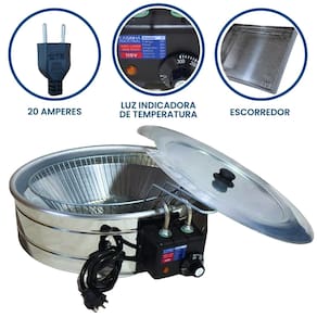 Tacho Redondo 7 Litros + Escorredor G + Tampa. Termostato regulável de qualidade e com alça para escorrer o óleo e deixar sua fritura sequinha e com cabos reforçados e qualidade INOX. Capacidade Total da Cuba: 7 Litros. Capacidade de Óleo: de 4 a 5 Litros. Termostato Ajustável: De 50°C a 300°C. Uso: Comercial e Residencial.Porta-fio