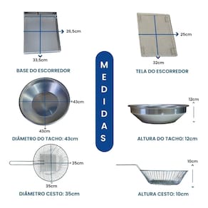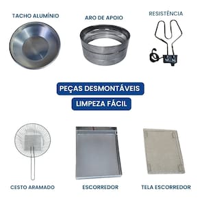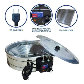 Tacho redondo 7 litros com escorredor médio e tampa. Termostato regulável de 50°C a 300°C. Cabos reforçados em inox. Uso comercial e residencial.Porta-fio