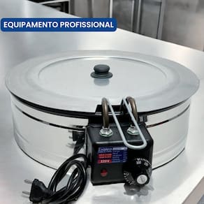 Tacho redondo esmaltado com tampa, termostato ajustável de 50°C a 300°C, uso comercial e residencial.