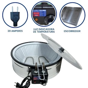Tacho esmaltado com tampa e escorredor G. Termostato regulável de 50°C a 300°C. Cabos reforçados em Inox. Uso comercial e residencial.Porta-fio