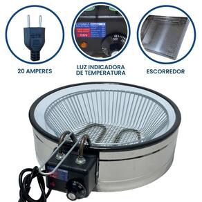 Tacho esmaltado com capacidade de 7 litros, ideal para frituras em ambientes comerciais e residenciais. Possui termostato regulável de 50°C a 300°C, alça para escorrer óleo e cabos reforçados em inox. Inclui escorredor grande para frituras sequinhas.Porta-fio