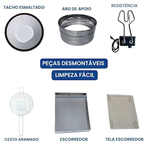 01 Aro Inox 01 Cabeçote com resistência blindada01 Cesto de fritura aramado01 Tacho esmaltado01 Escorredor M01 Manual de instruções