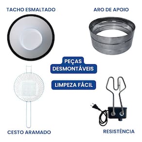 Fritadeira industrial elétrica com tacho redondo de 5 Litros esmaltado com tampa. Indicada para restaurantes, lanchonetes, quiosques e cozinhas residenciais. Tacho revestido com esmalte resistente à corrosão e fácil de limpar. Tampa inclusa para proteção e higiene.Porta-fio
