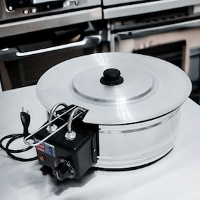 Tacho esmaltado com tampa, termostato ajustável de 50°C a 300°C, ideal para restaurantes, lanchonetes e cozinhas residenciais.