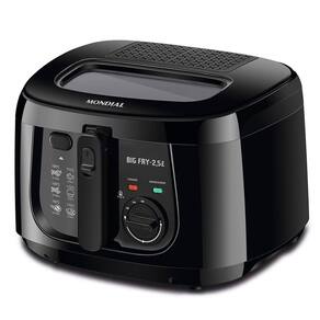 Com a fritadeira elétrica Big Fry 2,5L da Mondial, seus pratos ficam mais saborosos e sua cozinha sempre limpa. Você ainda pode preparar alimentos com a tampa fechada, zelando por sua segurança e de toda a família. Ideal para você que procura praticidade sem abrir mão do sabor a fritadeira da Mondial tem 2,5 litros de capacidade, cesta removível com cabo dobrável, tampa com abertura automática e removível, tampa com visor transparente permitindo visualizar o preparo do alimento; filtro de alumino, cuba antiaderente, lâmpada-piloto para sinalizar o produto em aquecimento ou na temperatura escolhida e seletor de temperaturas. Mondial, sua melhor escolha.