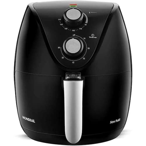 Fritadeira elétrica Mondial New Pratic com capacidade de 3,5 litros, temperatura ajustável até 200°C, timer de 60 minutos, cesta removível com revestimento antiaderente e lâmpadas piloto.Porta-fio