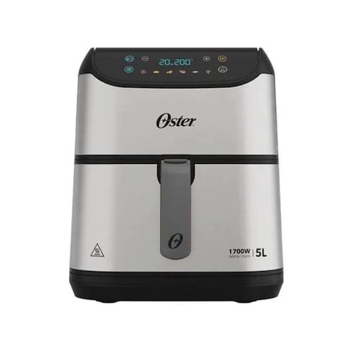 Air Fryer Digital Oster OFRT930 com capacidade de 5 litros, design em aço inox, painel digital com funções pré-programadas, timer de 60 minutos e temperatura ajustável de 80°C a 200°C.Porta-fio