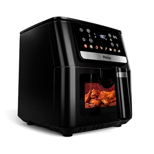 - Potência: 1700W - Capacidade: 6,5 litros - Revestimento cerâmico Redstone antiaderente - Painel digital com ícones luminosos - 8 funções pré-programadas - Função Favoritos - Visor Glass para acompanhamento do preparo - Sinal sonoro e luz interna “Turn” - Timer de 0 a 60 minutos - Controle de temperatura: 40°C a 200°C - Proteção contra superaquecimento - Desligamento automático - Cor: Preto com acabamento Inox - Tomadas: 20A de 3 pinos (110V) e 10A de 3 pinos (220V) - Dimensões: 30,3 x 28,2 x 37,2 cm - Peso: 4,3 kgPorta-fio