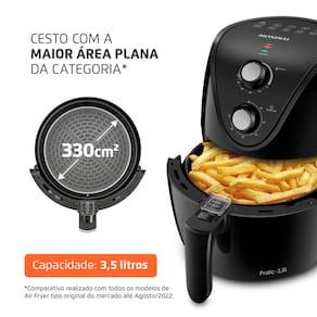 -A Tecnologia de Circulação de Ar Quente e a alta potência possibilitam rapidez no preparo das receitas e praticidade em sua rotina na cozinha; -Capacidade de 3,5 litros: ele é espaçoso para acomodar os alimentos; -Design compacto: a Air Fryer Mondial tem um design compacto e ocupa espaço reduzido na bancada da cozinha; -Antiaderente: o cesto possui o antiaderente Duraflon, e os alimentos não grudam no fundo; -Não é preciso utilizar óleo ou manteiga no preparo das receitas; -Fácil de limpar: a cuba e o cesto são removíveis e antiaderentes; -Controle de temperatura até 200°c: permite a escolha da temperatura ideal para diferentes tipos de alimentos; -Timer de 60 minutos: facilidade e comodidade de selecionar o tempo necessário de preparo das receitas; -Aviso sonoro + desligamento automático: após o tempo predefinido no Timer, há um aviso sonoro e a fritadeira desliga automaticamente; -Muito além de batata frita: A Air Fryer é versátil e permite que você prepare pratos que vão muito além da clássica batata frita. É possível preparar legumes, carnes, peixes, lasanha, pizzas, além de pratos doces, como pudim, bolo de chocolate e cookies. Use sua criatividade para fazer receitas deliciosas.Cesto removível