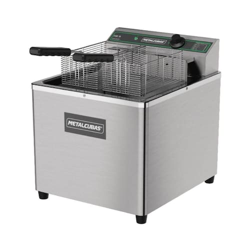 Fritadeira Elétrica Zona Fria de Óleo de Mesa FOE 15 M MetalcubasCompacta, ideal para pequenos espaços e podendo ser utilizada em bancada, a A Fritadeira Elétrica Zona Fria de Óleo de Mesa FOE 15 M Metalcubas é ideal para atender estabelecimentos do ramo gastronômico, que visam fazer frituras com qualidade e rapidez. Este equipamento possui o sistema de zona fria, em que os resíduos da fritura entram em decantação no óleo frio, assim economizando, pois não haverá necessidade de trocas constantes de óleo, além de minimizar a troca de sabores nos alimentos.Alguns diferenciais desse produto é que ele é fabricado externamente em aço inox escovado 430 e o tanque em aço inox 304, painel removível com resistências blindadas em aço inox, proteção das resistências e do bulbo do termostato em aço inox, termostato para controle de temperatura, termostato de segurança, lâmpada piloto que indica o funcionamento das resistências. Seu tanque possui capacidade máxima para 18 litros e mínima de 13 litros, possuindo a média de 15 litros como recomendação.Medidas do produtoProfundidade: 46,5 cmComprimento: 40,5 cmAltura: 40 cm Informações TécnicasCapacidade: 15 litrosCapacidade mínima: 13 litrosTensão: 110V ou 220VFrequência: 60 HzPotência: 3100 W 110V ou 5500 W 220V Peso líquido: 11,1 kg; GARANTIA: 6 mesesImagens meramente ilustrativas. Produtos sujeitos a alterações sem aviso prévio.