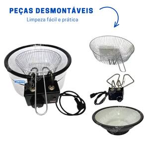 A fritadeira TEPlus – 5L é perfeita para o uso industrial ou doméstico. É compacta, ou seja, não ocupa muito espaço em seu comércio ou cozinha. Sendo fácil de manusear e tocar de lugar.O modelo TEPlus possui 1 cuba com a capacidade total de até 5 litros, sendo óleo + alimento. Possui cesto e cabeçote removíveis que facilitam sua limpeza e conservação.Fabricada com o termostato mais moderno e confiável do mercado elétrico, fritadeira atinge a temperatura esperada em aproximadamente 8 minutos (dependendo do ambiente) e seu termostato controla a temperatura e protege sua fritadeira.Possui resistência em aço inox e blindada fazendo com que esquente somente a parte baixa da resistência, evitando choques e queimaduras.CARACTERÍSTICAS GERAIS- Capacidade Total da Cuba: 5 Litros (óleo + alimentos)- Capacidade de óleo: 3 a 3,5 Litros- Termostato de 50°C a 300°C (com regulagem)- Material: Aço Inoxidável e Ferro Esmaltado na cor Branco- Voltagens 110v e 220v (NÃO É BIVOLT) – Escolher a voltagem no anúncio- Lâmpada piloto de aquecimento (Indicativo de Acionamento Automático)- Cuba gastronômica esmaltada na cor branca- Cesto de FrituraInstruções Rápidas:- O controle de temperatura segue a linha da lâmpada de aquecimento. Na dúvida de onde ligar, ouça o "Click".- A fritadeira está ligada quando o piloto acender (luz vermelha);- Nunca ligar a fritadeira sem óleo;- Cuidado com a temperatura acima de 200 graus, pode ocorrer queima do óleo;- Para testar a quantidade de óleo, faça a MEDIÇÃO COM ÁGUA e com a fritadeira DESLIGADA. Feito a medição da quantidade, retire a água e seque bem a cuba. JAMAIS LIGUE A FRITADEIRA COM ÁGUA E NEM MISTURE ÁGUA E ÓLEO;- Quando a temperatura indicada for atingida, o piloto se apaga e a fritadeira está pronta para ser usada;- A operação de imersão deve ser lenta para que evite que o óleo transborde;- Manter sempre 3 litros de óleo na cuba, isto é, repor quando o nível baixar. A frequência de troca do óleo depende da utilização.Informações técnicas:- 110V – 1.600 Watts- 220V – 1.600 Watts- Tomada: 10A- Medidas da Fritadeira.=> Cuba profundidade: 12,5 cm x Diâmetro Cima: 30 cm x Diâmetro base: 17,5 cm=> Base Altura: 12 cm x Diâmetro: 31 cm- Uso Comercial e Residencial- Não incluso tampaCONTEÚDO DA EMBALAGEM- 01 Base em aço inox - 01 cabeçote com resistência- 01 cesto aramado ou cromado (sem opção de escolha)- 01 cuba esmaltada na cor branco- 01 Manual de instruçõesPERGUNTAS FREQUENTES:As partes são removíveis?- Sim, todas as partes (cabeçote, cesto, cuba) são removíveis.Quantos graus atinge?- de 50 a 300 grausQuantos litros de óleo?- de 3L a 3,5 Litros (sobrando espaço para os alimentos)Posso fritar quais tipos de alimentos?- Quaisquer tipos de alimentos. Salgados, pastel, kibe, mandioca, calabresa, batata, peixes dentre outros.Posso fritar pastel?- Sim, desde pastéis pequenos, onde é necessário utilizar o cesto, até pastéis de 28 cm, onde não se utiliza o cesto.O cesto é aramado ou cromado?- Temos as 2 opções de cesto, dependendo da disponibilidade e sem opção de escolha.A cuba é esmaltada?- Sim, na cor brancoA tomada é normal?- O plugue é o de 10APode ligar diretamente na tomada de casa?- Sim, qualquer tomada normal Quantos watts utiliza?- Utiliza 1600W nas duas voltagens, 127v e 220v