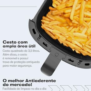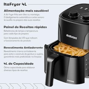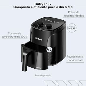 Vantagens da Fritadeira ItafryerPainel de Receitas Rápidas: Facilite o seu dia a dia com opções de preparo ágeis e convenientes.Timer Inteligente de 60 Minutos: Ajuste o tempo de cozimento com precisão, garantindo resultados sempre perfeitos.LEDs de Funcionamento e Aquecimento: Monitore o status de preparo com indicadores luminosos claros.Potência de 1400W: Cozimento rápido e uniforme para refeições mais saborosas.Controle de Temperatura até 200C: ibilidade total para explorar uma ampla variedade de receitas.Desligamento Automático e Aviso Sonoro: Segurança e praticidade com desligamento automático e alerta sonoro.Design em Preto Fosco: Um toque de sofisticação que combina com qualquer estilo de cozinha.Grelha Removível: Facilite a limpeza com uma grelha que pode ser removida para higienização.Trava de Proteção Antiqueda: Segurança extra para um uso tranquilo e sem preocupações.Medidas: Largura: 31,9 cm | Profundidade: 31,9 cm | Altura: 31,6 cm.Atributos do Produto