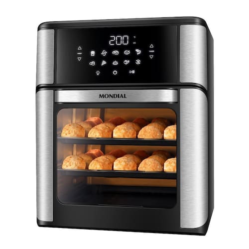 Fritadeira Eletrica Air Fryer Mondial Oven AFO-12L-BI 12L 2000W. Prepara alimentos de forma mais prática, além de fritar sem óleo, assa, cozinha e gratina. Possui 10 funções predefinidas e tecnologia de circulação de ar quente. Cesto e assadeiras com antiaderente Duraflon.Porta-fio