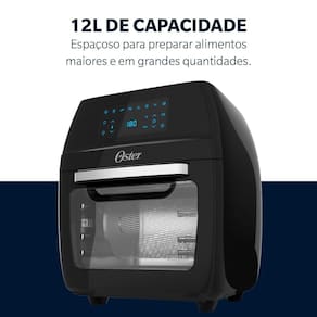 Fritadeira Forno 3 em 1 Oster com capacidade de 12 litros, 9 funções, display digital, rotação 360 graus e design moderno.Porta-fio