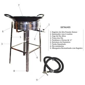 Fogão Pasteleiro Roa Grande com Tacho é especial, pois torna seu alimento crocante e perfeito!Imagine o aroma irresistível de pastéis dourados preenchendo sua cozinha. Economize tempo e energia, o fogão te auxilia em fazer seu alimento em menos tempo pois é adequado para frituras em geral.Possui queimador de alta pressão, acompanha Tacho nº22.Utiliza gás de botijão. Serve para frituras em geral industrial.Informações TécnicasMarca: Indústria ROAMaterial: Chapa de InoxDimensões do Pasteleiro: Altura Total 76cm x Diâmetro da Boca 44cmDimensões do Queimador: Comprimento Total 440m x Diâmetro 170mm com 08 Caulins (bicos espalhadores de chama)Pés de Alta Resistência removíveis com Pintura EletrostáticaRegistro Zamac com Injetor 0,40mmPeso: 6kgEmbalagem: 01 Pasteleiro Inox Profissional com Tacho para Fritutas > Tamanho Grande.