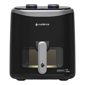Fritadeira sem óleo Cadence Delicook Fryer Show com visor transparente, luz interna, capacidade de 4,2 litros, potência de 1350W, timer de 60 minutos e seletor de temperatura de 80°C a 200°C. Possui 7 funções pré-definidas e grelha removível Easy Clean.Porta-fio