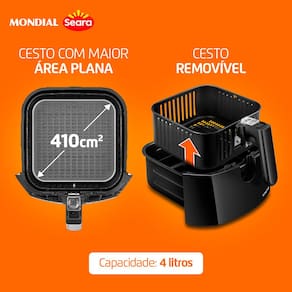 Capacidade de 4 Litros: O cesto quadrado com a maior área plana da categoria*, prepara grandes porções e acomoda melhor os alimentos, sem empilhar a comida e permitindo o cozimento por igual.