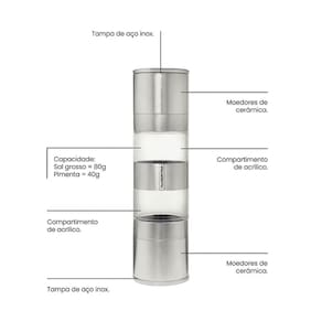 - Possui dois recipientes de moagem, uma na parte superior e uma na parte inferior da unidade. Para moer do outro lado, basta vira-lo de cabeça para baixo e continuar a moagem.