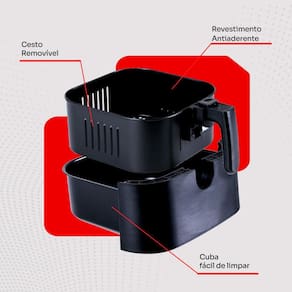 Fritadeira sem óleo com 1700W de potência e capacidade de 7 litros. Possui tecnologia de circulação de ar rápida, termostato ajustável de 80°C a 200°C, timer de 60 minutos com desligamento automático e alarme. Conta com cesto removível, proteção contra aquecimento, alça e estrutura cool touch, sistema anti-respingos e trava de segurança.Porta-fio