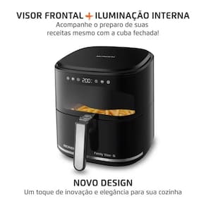 A Air Fryer Grand Family Digital Visor Mondial oferece praticidade e recursos modernos em um único aparelho. Com visor frontal transparente e iluminação interna, permite visualizar o preparo mesmo com a cuba fechada. Seu painel digital touch proporciona controle preciso de tempo e temperatura. Com capacidade de 5 litros, o modelo apresenta excelente aproveitamento de espaço e cozimento uniforme. A potência de 2.000W favorece agilidade nas preparações do dia a dia.