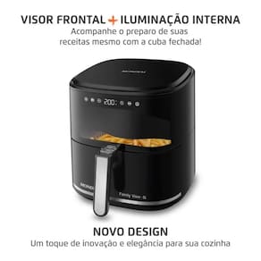A Air Fryer Grand Family Digital Visor Mondial une praticidade e inovação em um único aparelho. Seu visor frontal e iluminação interna permitem acompanhar todas as etapas do preparo com a cuba fechada. Ela possui um painel digital touch que oferece controle preciso de tempo e temperatura, além de um design moderno e elegante. Com capacidade de 5 litros, acomoda os alimentos perfeitamente e garante a distribuição uniforme do ar quente. A potência de 2.000W proporciona eficiência e agilidade na cozinha. Descubra todas as funcionalidades da AF-50-DV da Mondial: