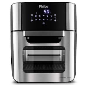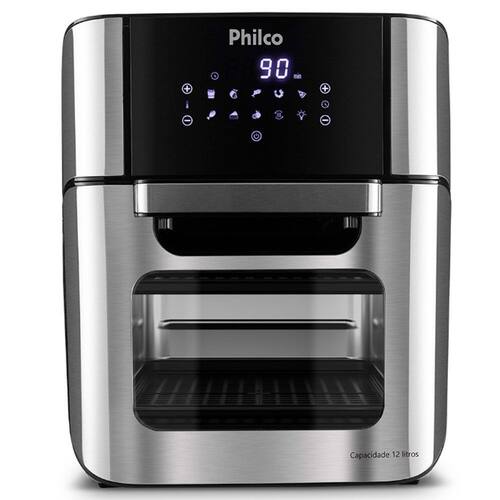 Características Gerais do produto Fritadeira semetros óleo e forno elétrico Philco PFR2200P cometros capacidade de 12 litros, 1800W de potência, temetrosperatura ajustável de 80°C a 200°C, timetroser de 90 metrosinutos, cesto antiaderente remetrosovível, função desidratar, painel digital touch e 9 funções pré-programetrosadas.
