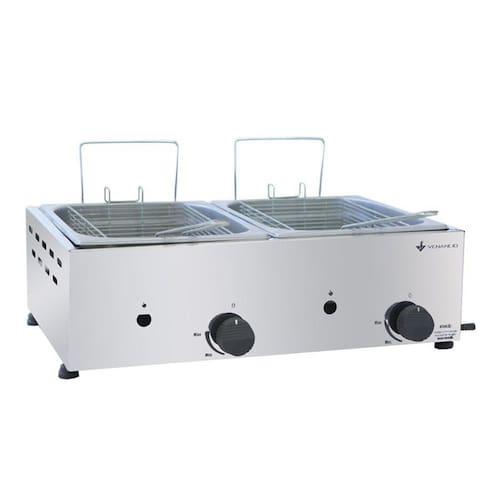 Material aço inox 430. - Modelo SFG212 - Prepara Salgados e frituras em geral. - Trabalha á gás GLP baixa pressão. - Cuba para óleo estampada em aço inox no modelo Gastronorm de 1/2 - Medida de cada cuba: 26,5cm x 32,5cm x 10cm - Manipulador com regulagem de 3 posições Desligado, mínima e máxima - Orifício central nos modelos á gás para facilitar o acendimento - Capacidade mínima óleo - 2 x 3,0Lts. - Capacidade máxima óleo - 2 x 4,8Lts. - Consumo Médio 0,530 Kg/h. - Potência gás: 6.042 Kcal/H - Acompanha 2 Cesto Removível : 24cm x 18cm x 9cm Alt. - Capacidade Nominal total 9,6 Lts.
